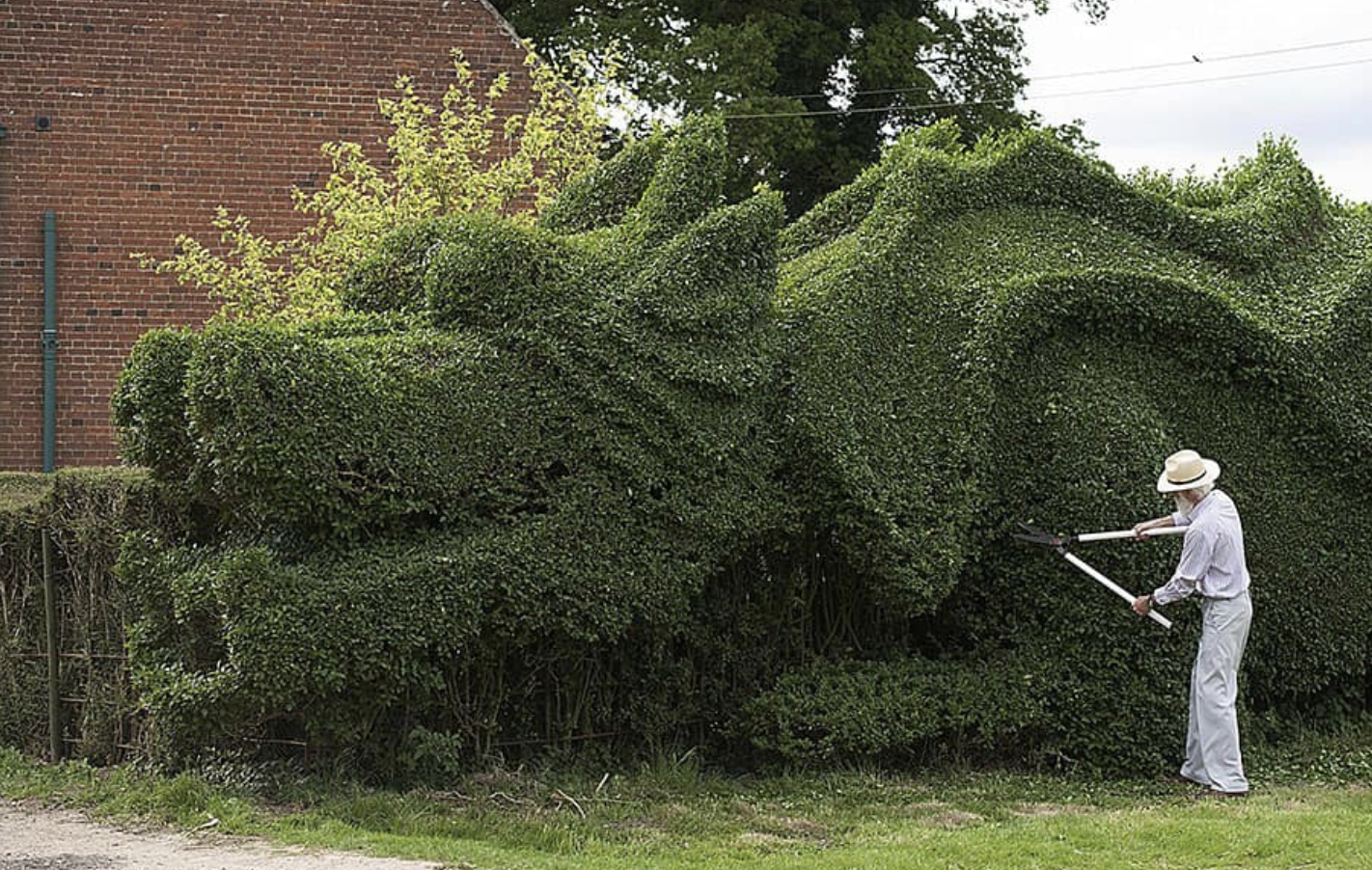 However, John did it differently. He was not content pruning bushes and growing daisies. Instead, he set his sights on something much bigger, mammoth even, legendary you might say. John decided to turn one of his hedges, into a 150-foot dragon. Using all of his gardening know-how and some of his wife’s graphic design skills. John created a design for a dragon and got his shears to work.